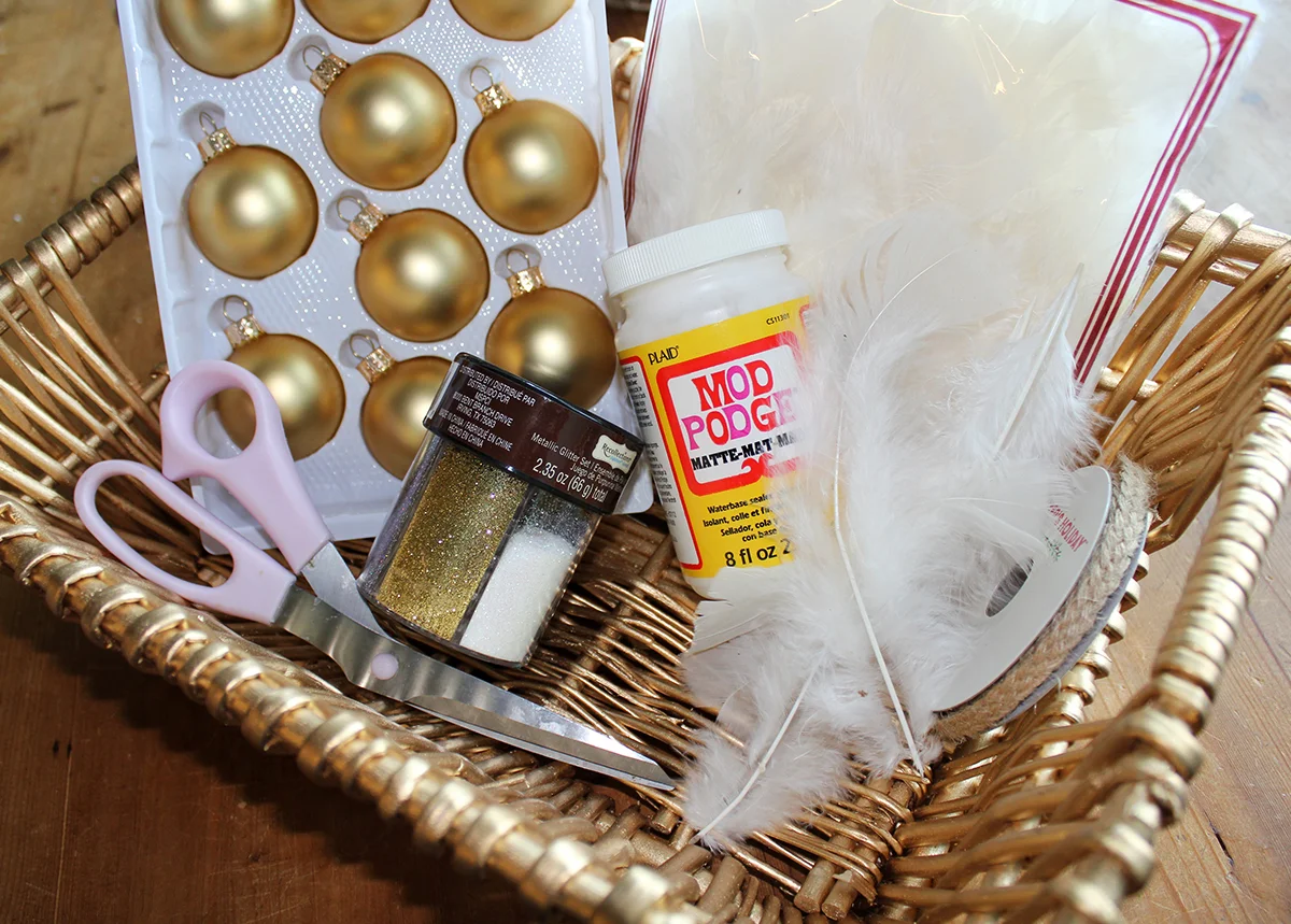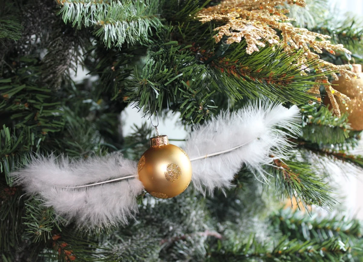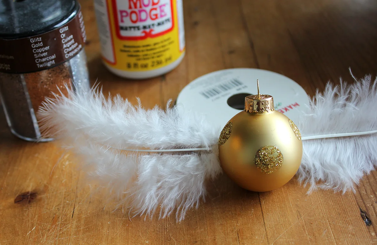 Next, hot glue feathers onto both sides of the ornament. These represent the wings of the snitch. To help the ornament dry completely, put string through the ornament hanger at the top, and hang the ornament in the air. That way it isn't rolling around while trying to dry.