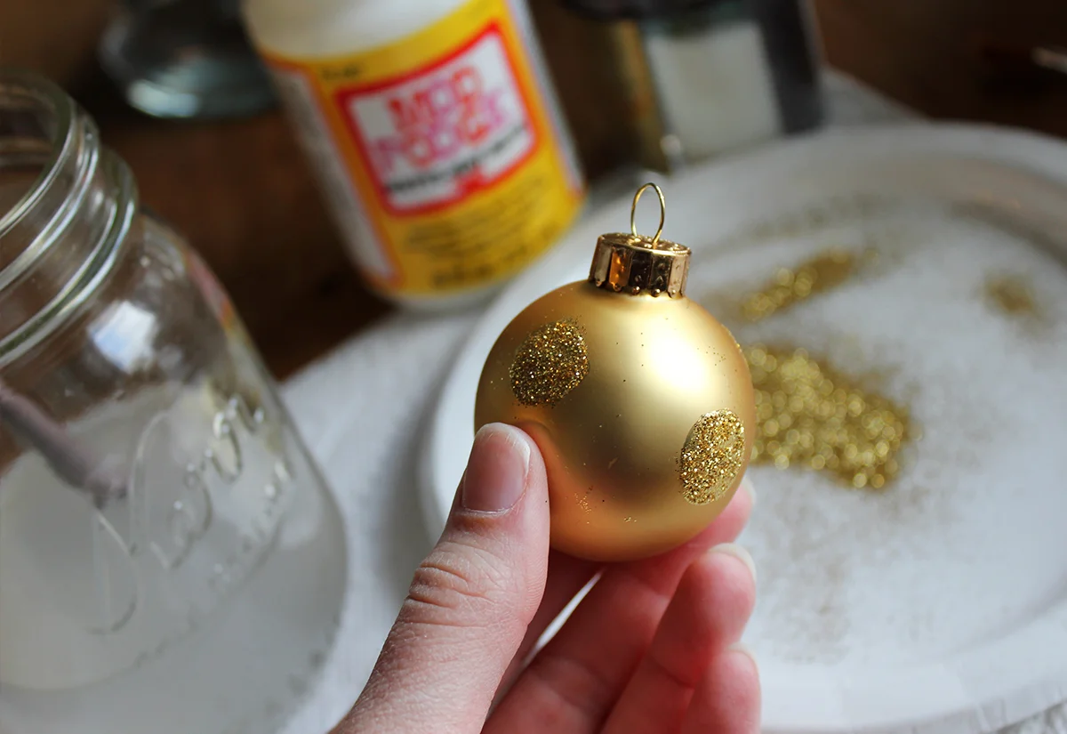 First, use a paint brush to make a design on the gold ornament with Mod Podge. I decided to make polka dots, but you can do any sort of design! Then, sprinkle the glitter on top of the glue on the ornament (make sure a paper plate is underneath!). Let them dry for about 20 minutes before moving to the next step.